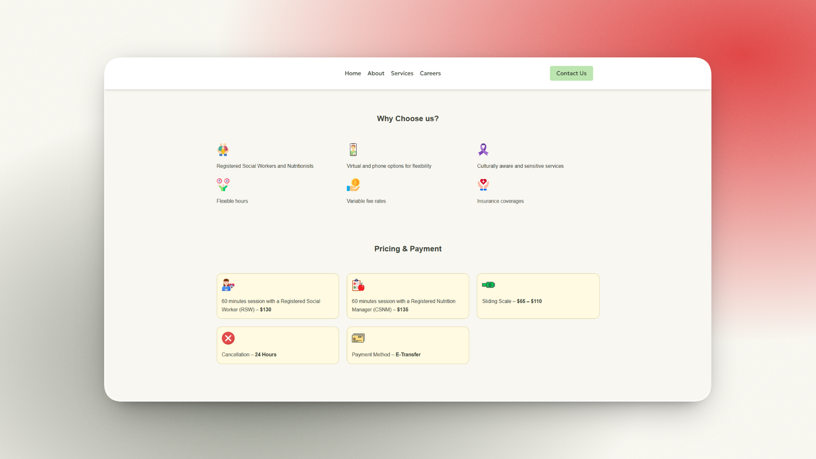 We designed a minimal and reassuring interface using soft content flow, structured sections, and clear call-to-actions to guide visitors naturally from understanding services to making contact. Special focus was given to readability, trust-building, and mobile responsiveness.
